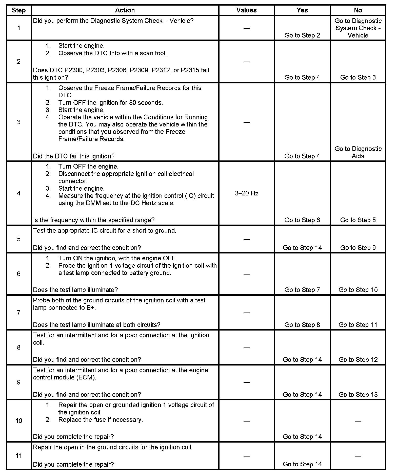 4. This step tests that the ECM is commanding the ignition coil ON and OFF via the ignition control circuit. If the frequency is not between 3-20 Hz, test the ignition control circuit for a short to ground.