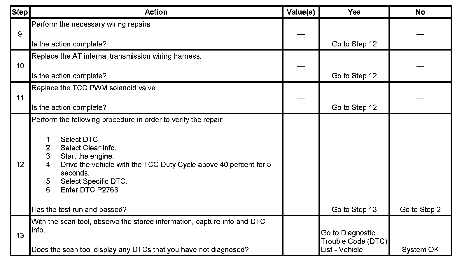DTC P2763 sets when the TCM detects an short to voltage in the TCC PWM solenoid valve circuit when the PWM duty cycle is 45 percent or greater for 4.3 seconds.