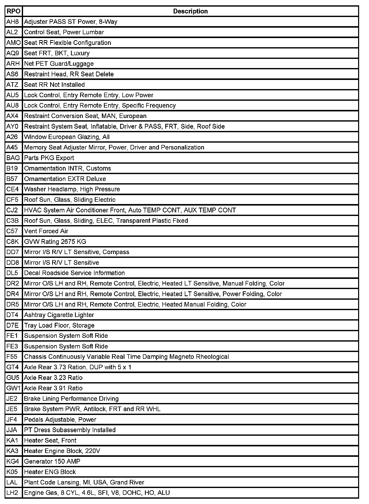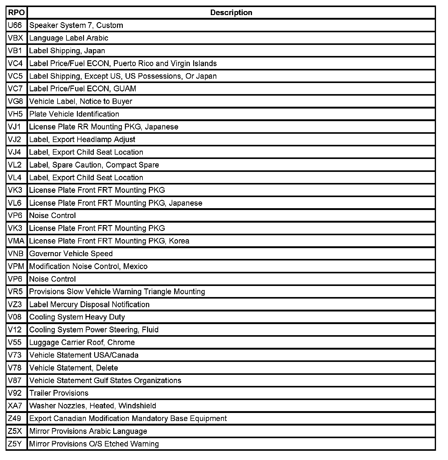 The table provides the description of the Regular Production Option (RPO) codes that are available on the vehicle. The vehicle's RPO list is printed on the Service Parts Identification Label.