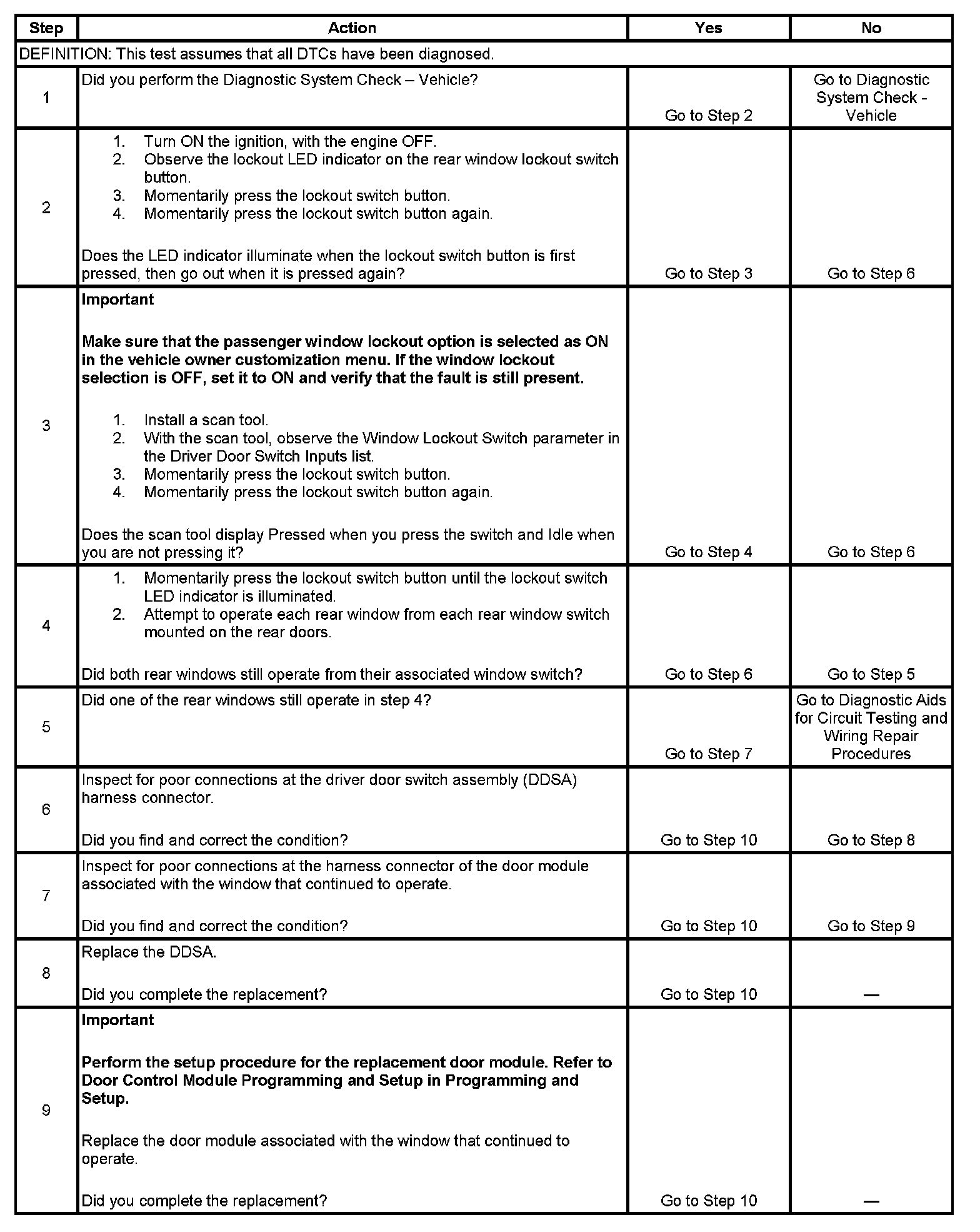 3. This step determines if the driver door switch assembly (DDSA) recognizes the lockout switch input.