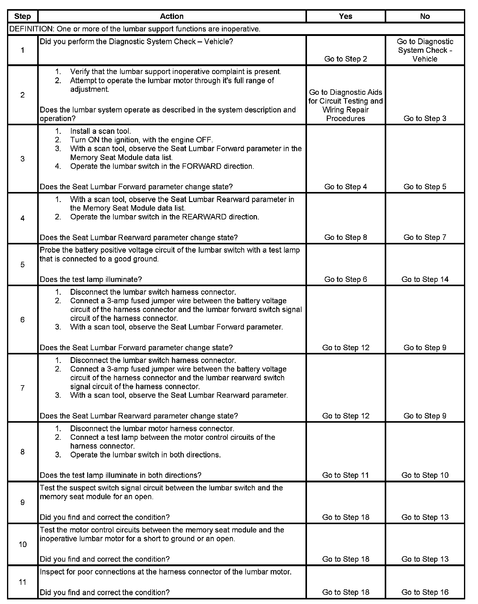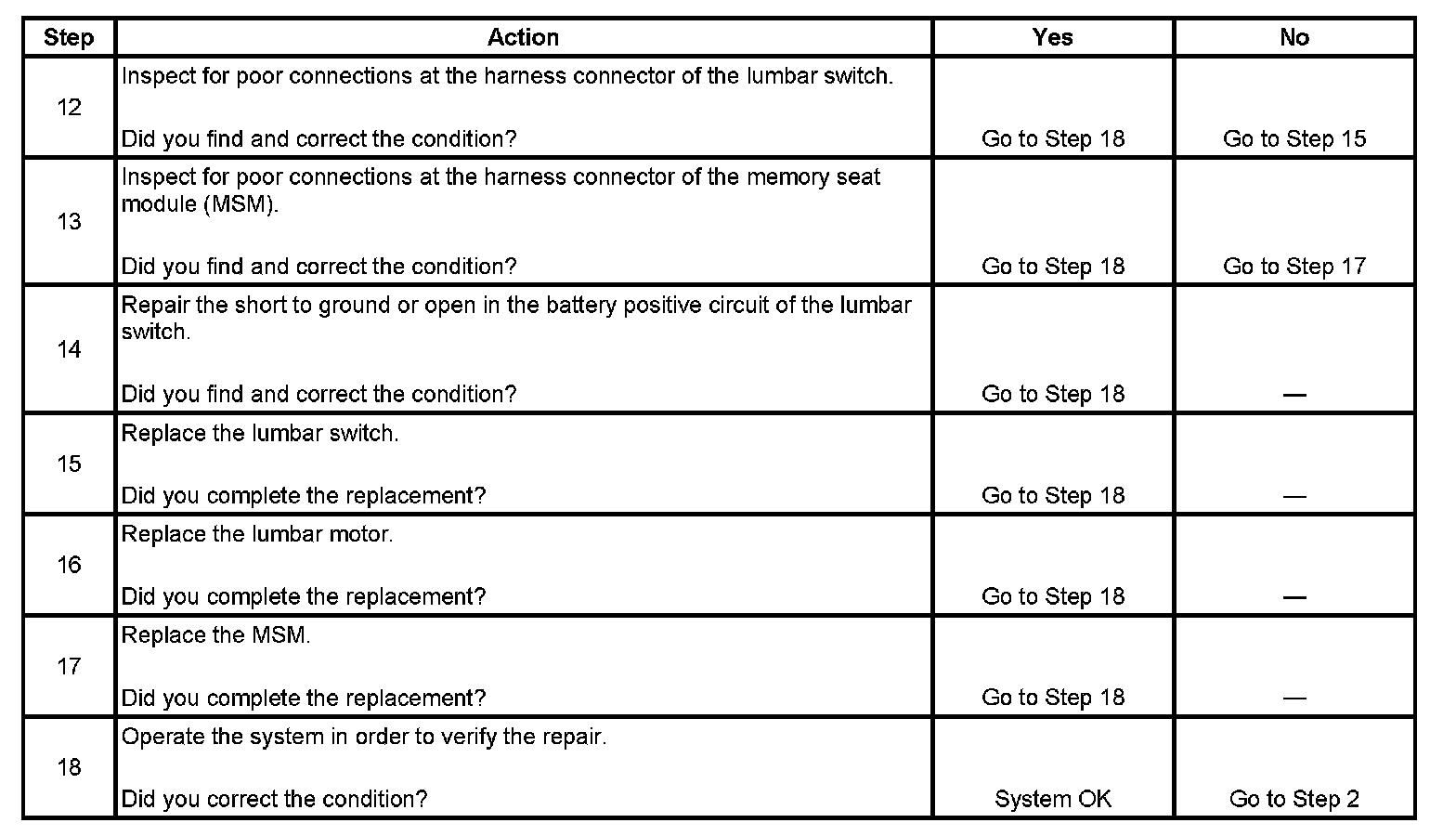 7. This step tests the integrity of the signal circuits of the seat lumbar switch. If the fuse in the jumper wire opens when you perform this test, a short to ground may have occurred.