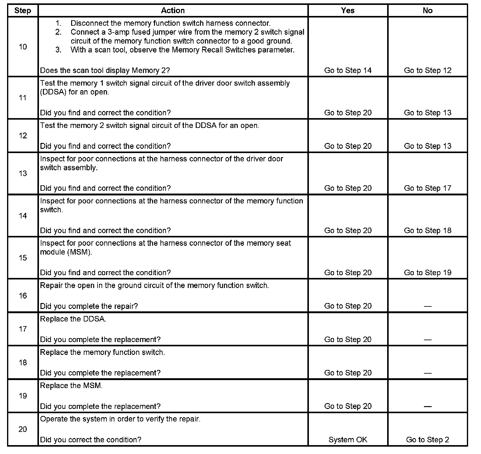 10. This step tests the integrity of the memory 2 switch signal circuit of the driver door switch assembly. If the fuse in the jumper wire opens when you perform this test, a short to battery voltage may have occurred.