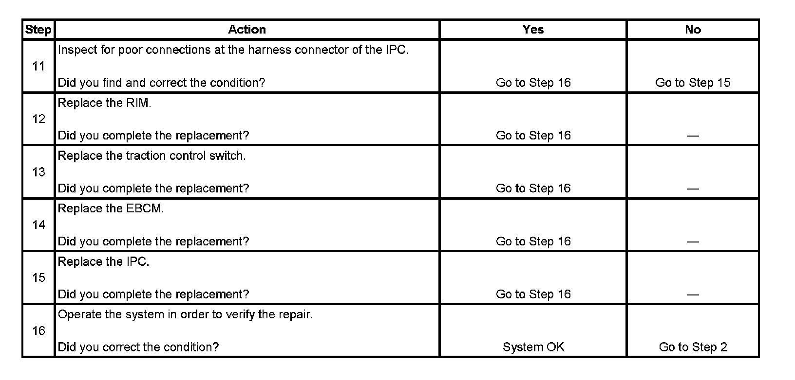 The Traction Off indicator is controlled by the instrument cluster via serial data messages from the EBCM. When the RIM sees the traction control switch input grounded through the momentary traction control switch, it sends a serial data message to the EBCM that tells the EBCM that the traction control switch has been pressed. The EBCM then disables traction control and sends a serial data message to the instrument cluster to turn on the Traction Off indicator on the instrument panel. Each time the ignition is cycled from OFF to ON, the traction control system is enabled.