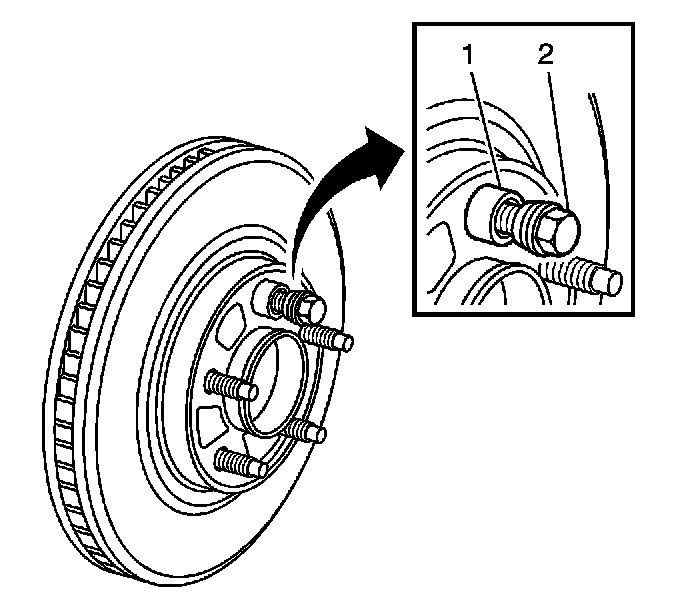 4. Hold the rotor firmly in place against the hub/axle flange and install one of the J 45101-100 (1) and one lug nut (2) onto the upper-most wheel stud.