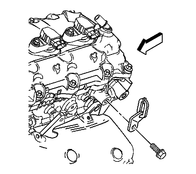 1. Use a grade 10.9, M10 X 1.5 X 35 bolt (GM P/N 11519182 or equivalent) in order to install an engine lift bracket (OTC #7100, J36857 or equivalent) to the front of the right (Bank 1) cylinder head in the location shown.