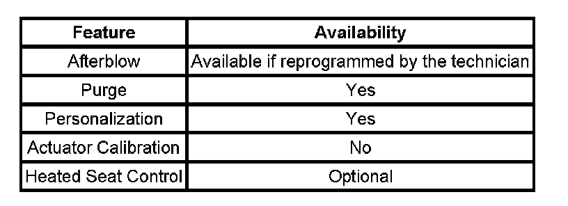 The HVAC control module will receive information that defines the current driver of the vehicle from the driver door module (DDM) through class 2 communication. The HVAC system will memorize the following system configurations for up to 2 unique drivers: