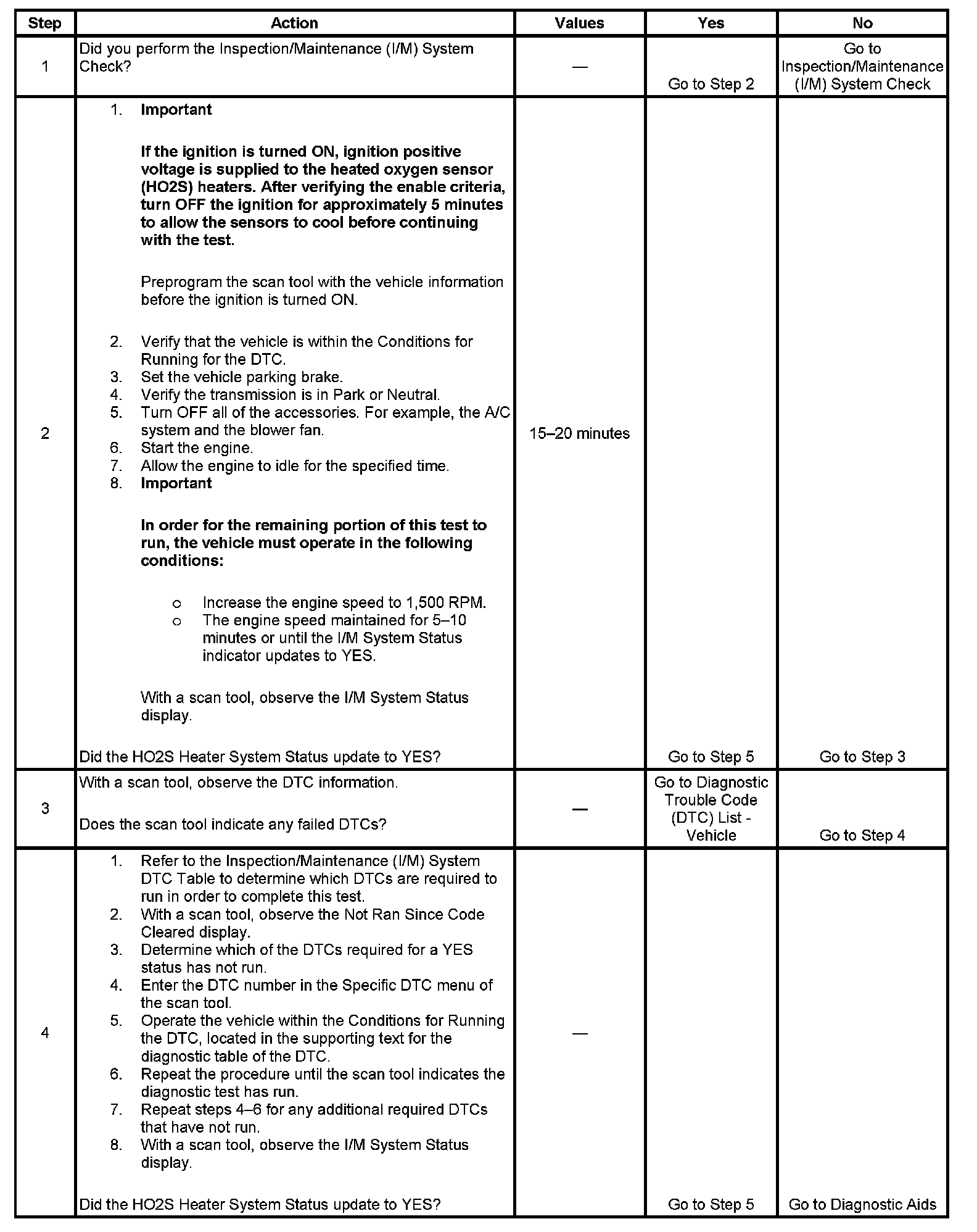 The purpose of this test is to satisfy the enable criteria necessary to execute I/M readiness diagnostics for the heated oxygen sensor (HO2S) system. The test may be used to set the I/M System Status to YES. Ensure the vehicle meets the requirements listed in Conditions for Running before performing this test. Failure to meet the necessary requirements may produce inaccurate test results.