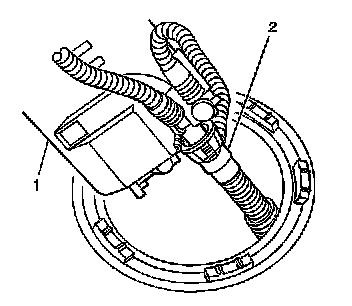 5. Carefully lift the primary fuel tank module (1) from the fuel tank only enough to access the transfer tube (2).