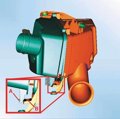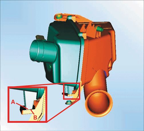 The air cleaner (outlet side) may be difficult to reinstall in the proper position if it has been fully removed from the housing. The tabs on the cover must be correctly aligned with the hinge slots in the (inlet side) housing. It is possible to incorrectly reassemble the cover to the housing without the cover being seated properly at the hinge. This condition may not be visible when viewing the box from the top.
