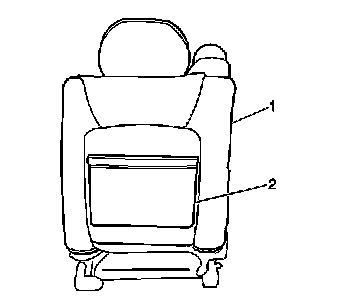 7. Install the seat back panel (2) to the seat (1) by sliding the bottom of the panel into place and pushing the top of the panel in until the push-in retainers are secure.