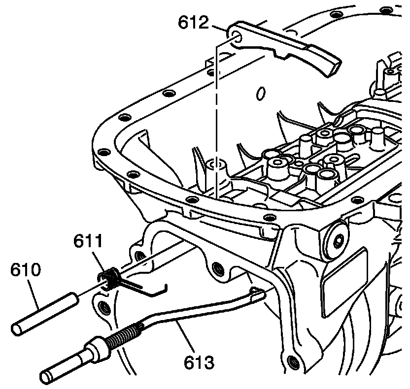 4. Install the park pawl (612), the park pawl spring (611), and the park pawl shaft (610) into the case.