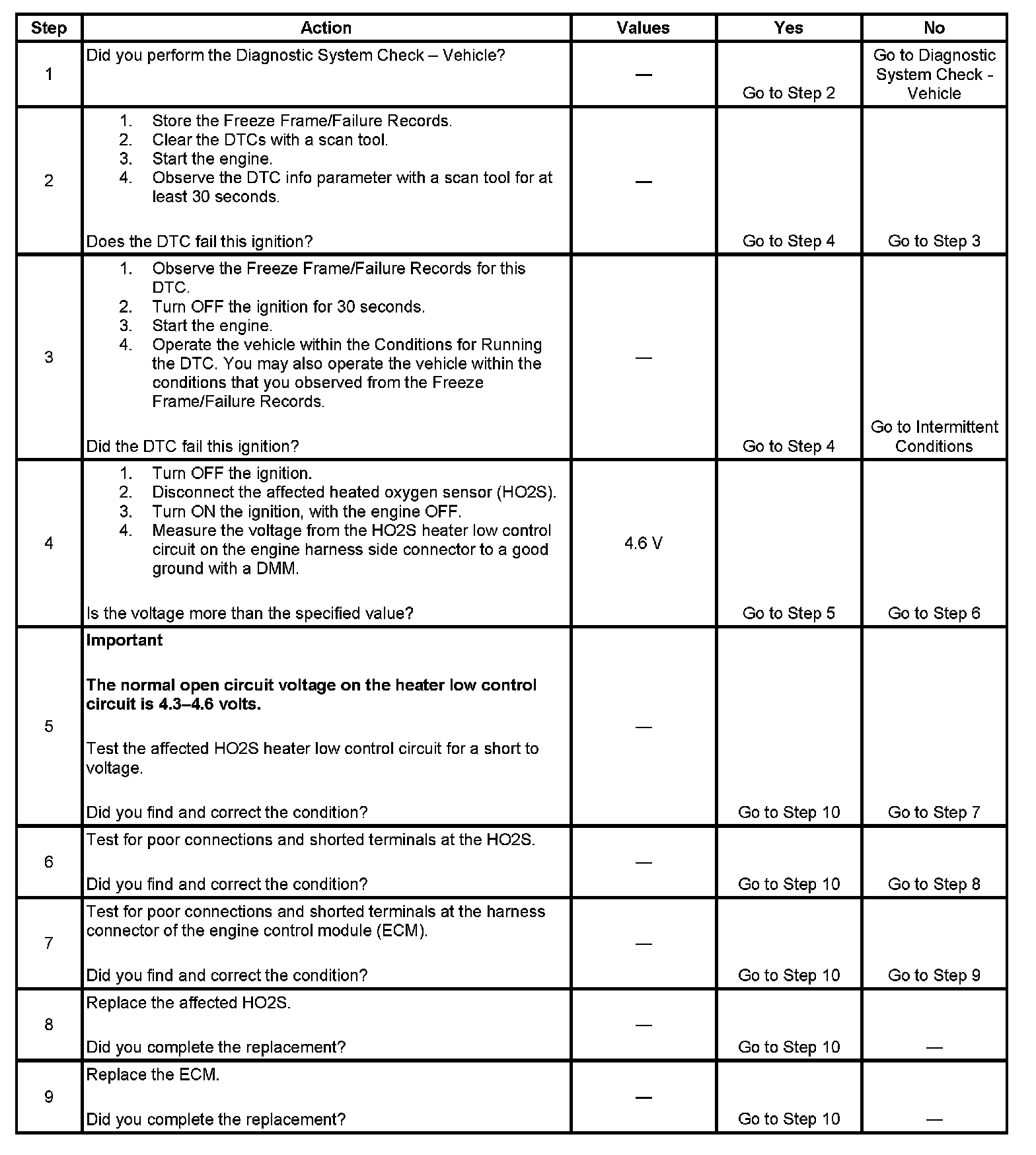 Heating elements inside the heated oxygen sensor (HO2S) minimize the time required for the sensors to reach operating temperature and provide an accurate voltage signal. A low side driver within the engine control module (ECM) is pulse width controlled to provide current to the heater elements. The ECM will not allow continuous HO2S heating until calibrated limits of time, temperature, and intake airflow have been reached. The ECM continuously monitors the HO2S heater current draw and operating state by briefly turning OFF the heater low side driver at regular intervals. A small reference voltage of approximately 4.5 volts is present at the heater low control circuit. When the low side driver is commanded ON the reference voltage is low, when the low side driver is commanded OFF the reference voltage is high, close to battery voltage. If the ECM detects that the HO2S heater low control circuit voltage is higher than 4.6 volts when the heater is commanded ON, the following DTCs will set: