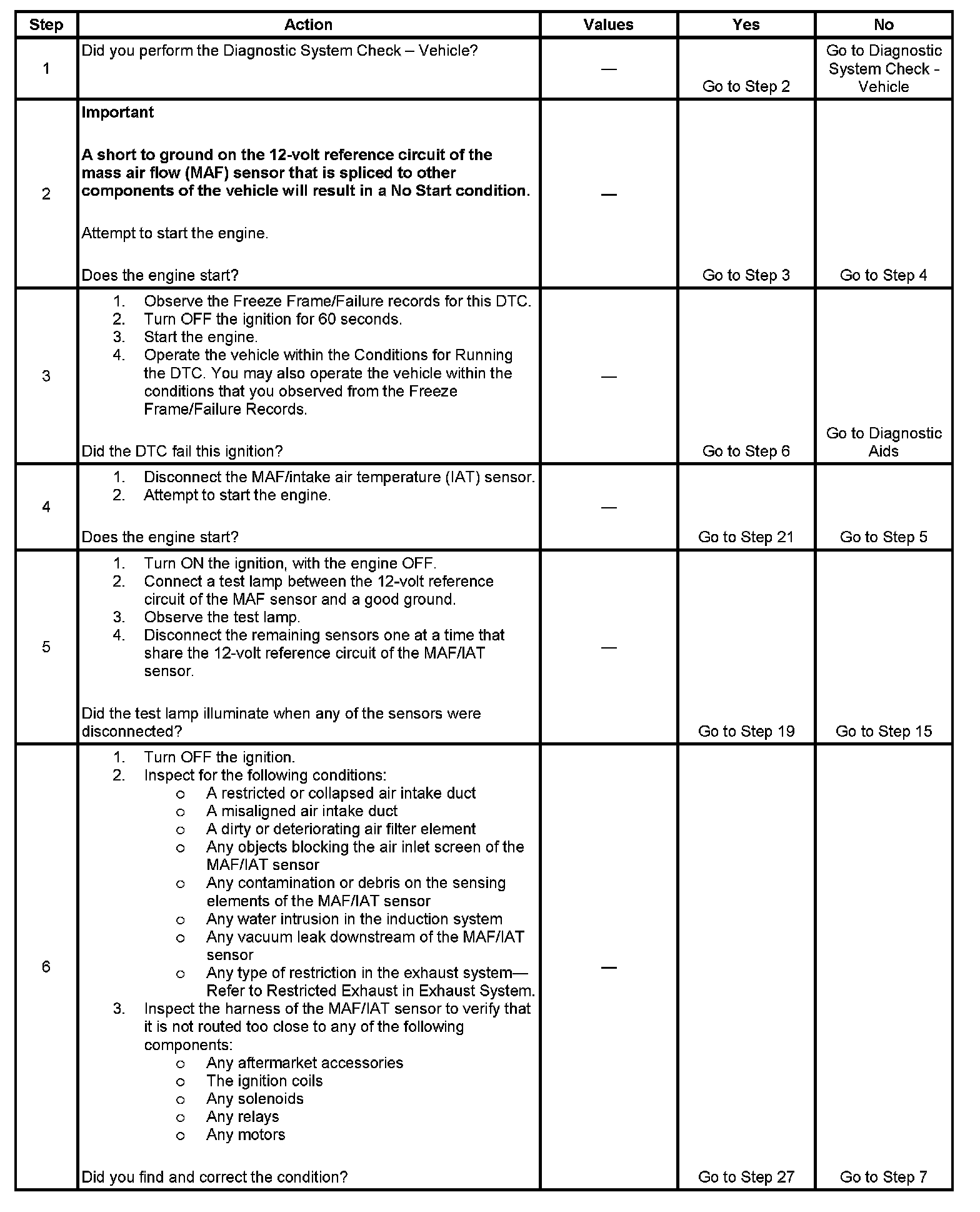 - A short between the MAF sensor 12-volt reference circuit and the IAT signal circuit will produce a stalling condition that becomes a Crank/No Start condition.