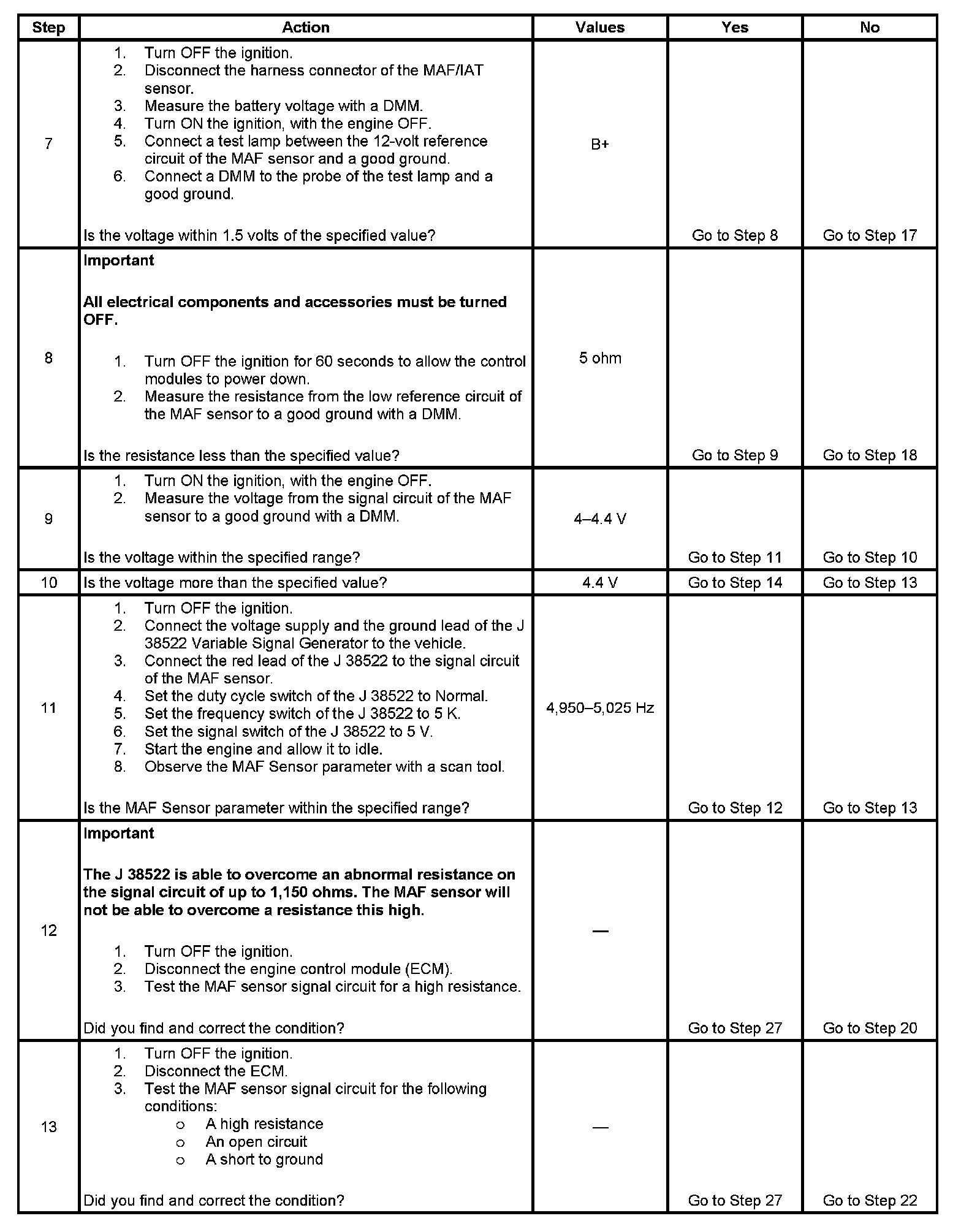 12. This step will determine if an abnormal resistance of less than 1,150 ohms has skewed the MAF sensor frequency signal.