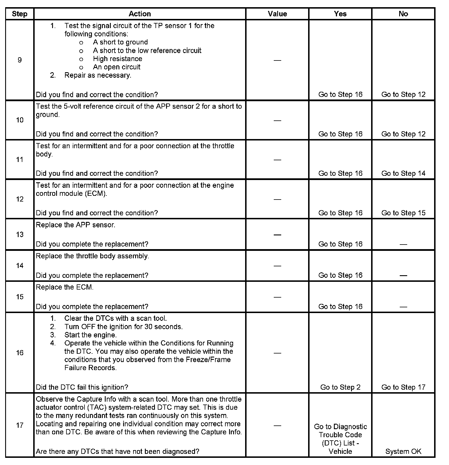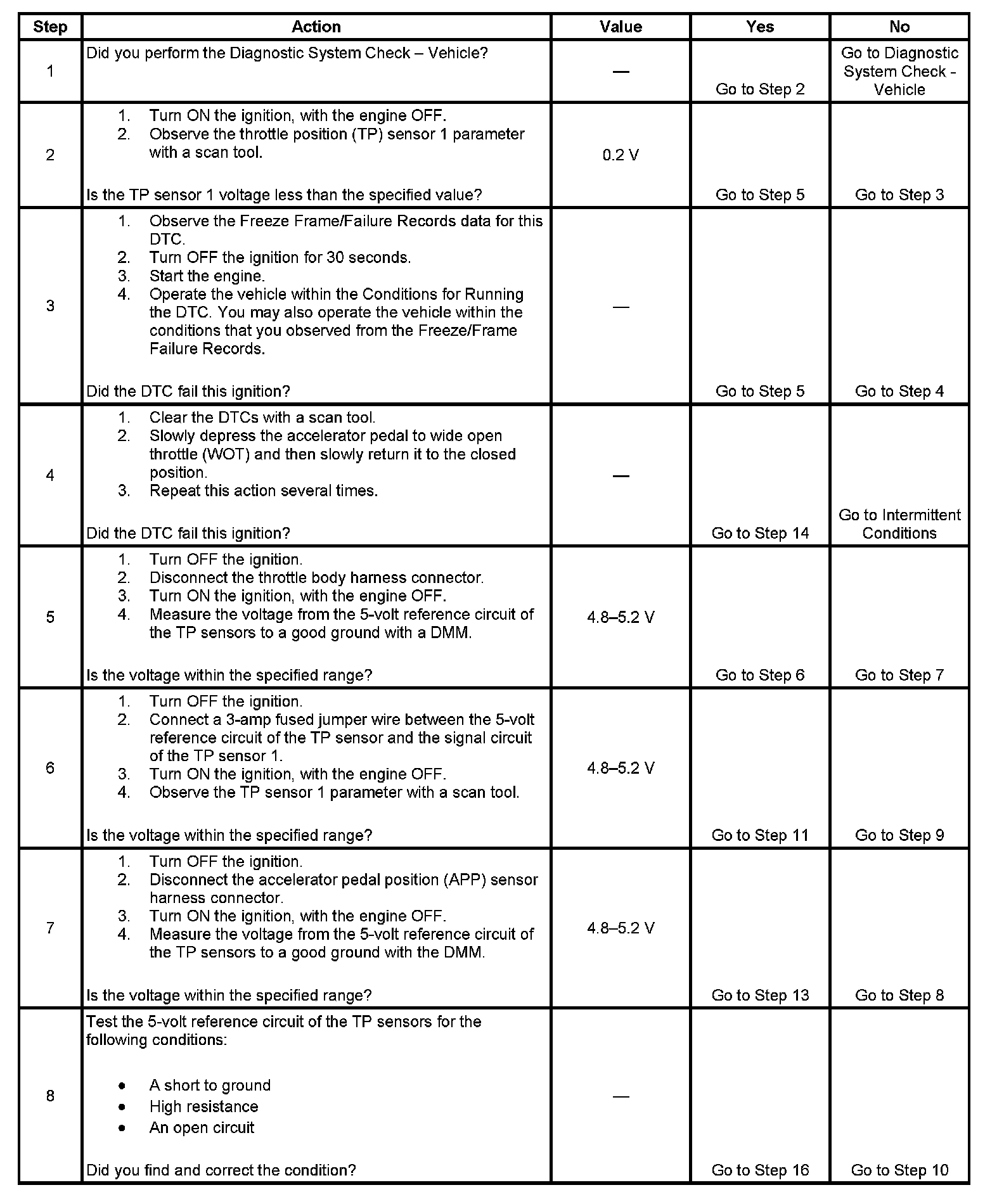 4. The ECM performs a comparison of the signals from both TP sensors during the entire range of operation. If the DTC does not set with the key ON and the accelerator pedal released, actuating the throttle may cause the DTC to set.