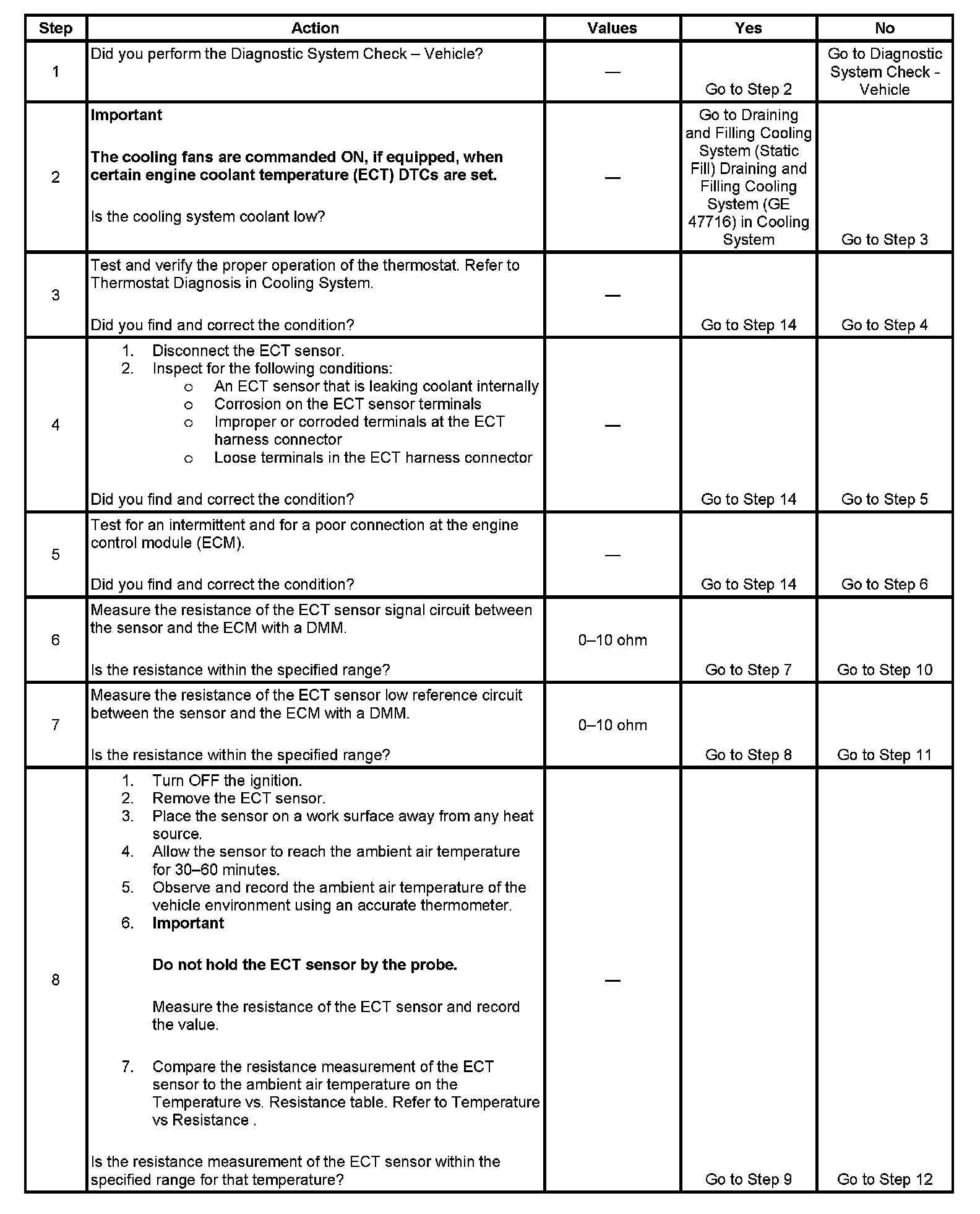 An engine coolant temperature (ECT) sensor monitors the temperature of the coolant. This input is used by the engine control module (ECM) for engine control and as an enabling criteria for other diagnostics. This input also determines if the ECT is insufficient for thermostat regulating of the coolant.