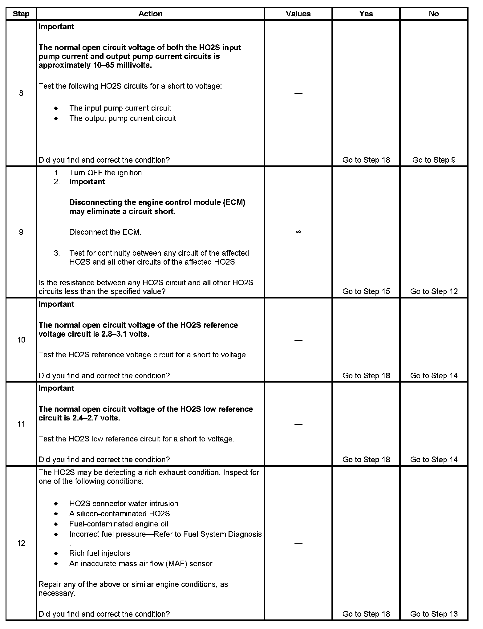 The wide band heated oxygen sensor (HO2S) measures the amount of oxygen in the exhaust stream more quickly and accurately than the switching style HO2S. The wide band sensor consists of an oxygen sensing cell, an oxygen pumping cell, and a heater. The exhaust gas sample passes through a diffusion gap between the sensing cell and the pumping cell. The engine control module (ECM) supplies a signal voltage to the HO2S and uses this voltage as a reference to the amount of oxygen in the exhaust system. An electronic circuit within the ECM controls the pump current through the oxygen pumping cell in order to maintain a constant signal voltage. The ECM monitors the voltage variation on the signal circuit, and attempts to keep the voltage constant by increasing or decreasing the amount of current flow or reversing the direction of the current flow to the pumping cell. By measuring the direction and amount of current required to maintain the signal voltage, the ECM can determine the concentration of oxygen in the exhaust. The signal voltage is displayed as a lambda value. A lambda value of 1 is equal to a stoichiometric air fuel ratio of 14.7:1. Under normal operating conditions, the lambda value will remain around 1. When the system is lean, the oxygen level will be high and the lambda value will be high, or more than 1. When the system is rich, the oxygen level is low and the lambda value will be low, or less than 1. The ECM uses this information to maintain the proper air/fuel ratio. If the ECM detects an HO2S circuit that is shorted to voltage, DTC P0132 will set for bank 1 sensor 1, or DTC P0152 will set for bank 2 sensor 1.