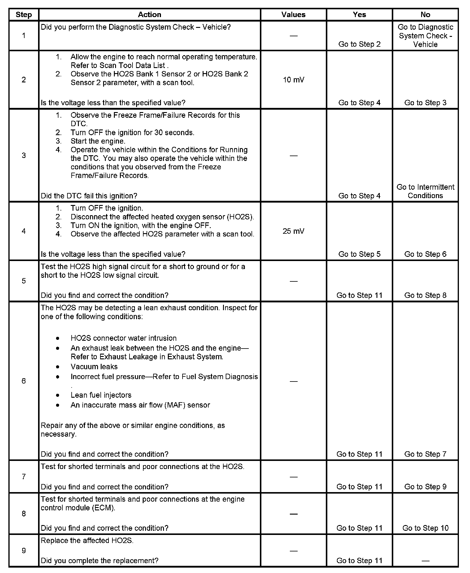 The heated oxygen sensor (HO2S) produces a voltage that varies between 100-900 mV under normal operating conditions. The engine control module (ECM) produces a bias voltage on the HO2S signal circuit of 420-480 mV. The reference ground for the sensor is provided through the ECM. The ECM monitors the signal voltage to determine if the exhaust is lean or rich. The oxygen sensor voltage is high when the exhaust is rich, and low when the exhaust is lean. The ECM constantly monitors the HO2S signal during the Closed Loop operation. If the ECM detects an HO2S voltage that stays below a specified value, or if the HO2S calculated resistance is below a specified value, DTC P0137 will set for bank 1 sensor 2, or DTC P0157 will set for bank 2 sensor 2.