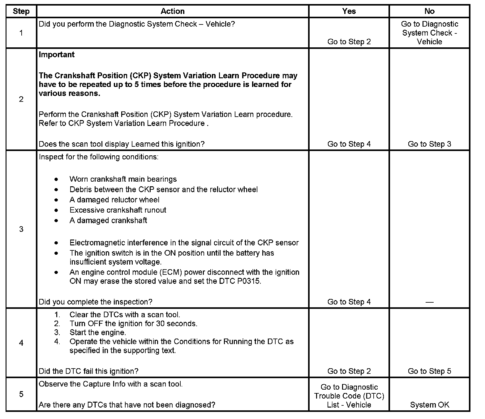 If the CKP system variation values are not stored in the ECM memory, DTC P0315 sets.