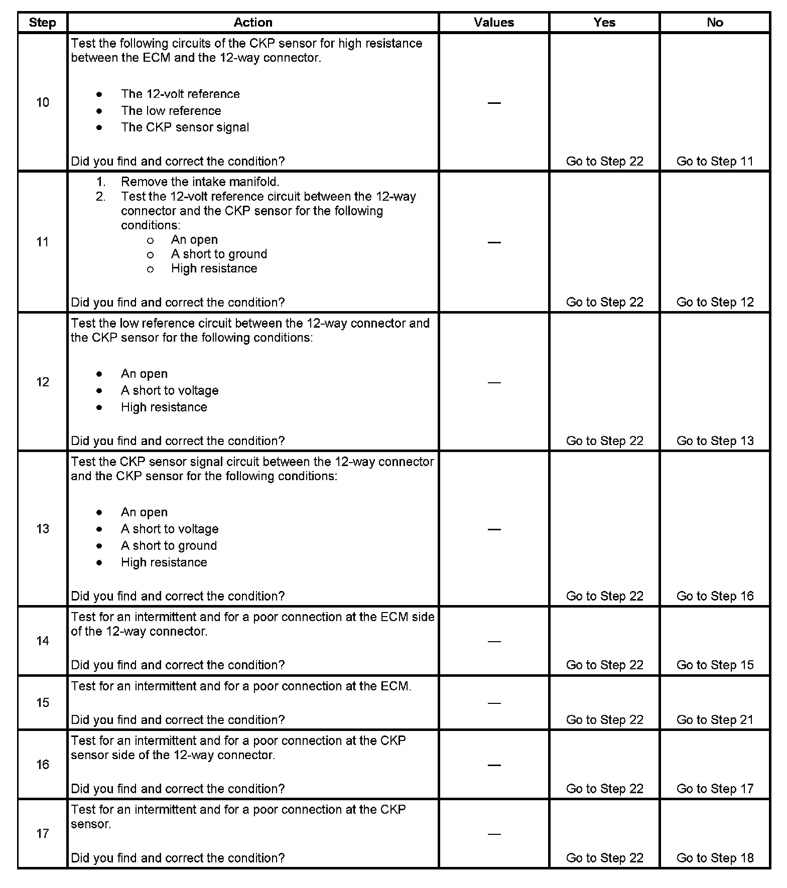 The crankshaft position (CKP) sensor signal indicates the crankshaft speed and position. The CKP sensor produces a DC voltage of varying amplitude and frequency. The frequency depends on the velocity of the crankshaft, and the DC output voltage depends on crankshaft position and battery voltage. The CKP sensor works in conjunction with a 58-tooth reluctor wheel attached to the crankshaft. The engine control module (ECM) determines the crankshaft position by the reference gap. The ECM can synchronize the ignition timing, fuel injector timing, and the spark knock control based on the CKP sensor and the camshaft position (CMP) sensor inputs. The CKP sensor is also used to detect a misfire. The CKP sensor circuits connect directly to the ECM. The circuits between the CKP sensor and the ECM consists of the following: