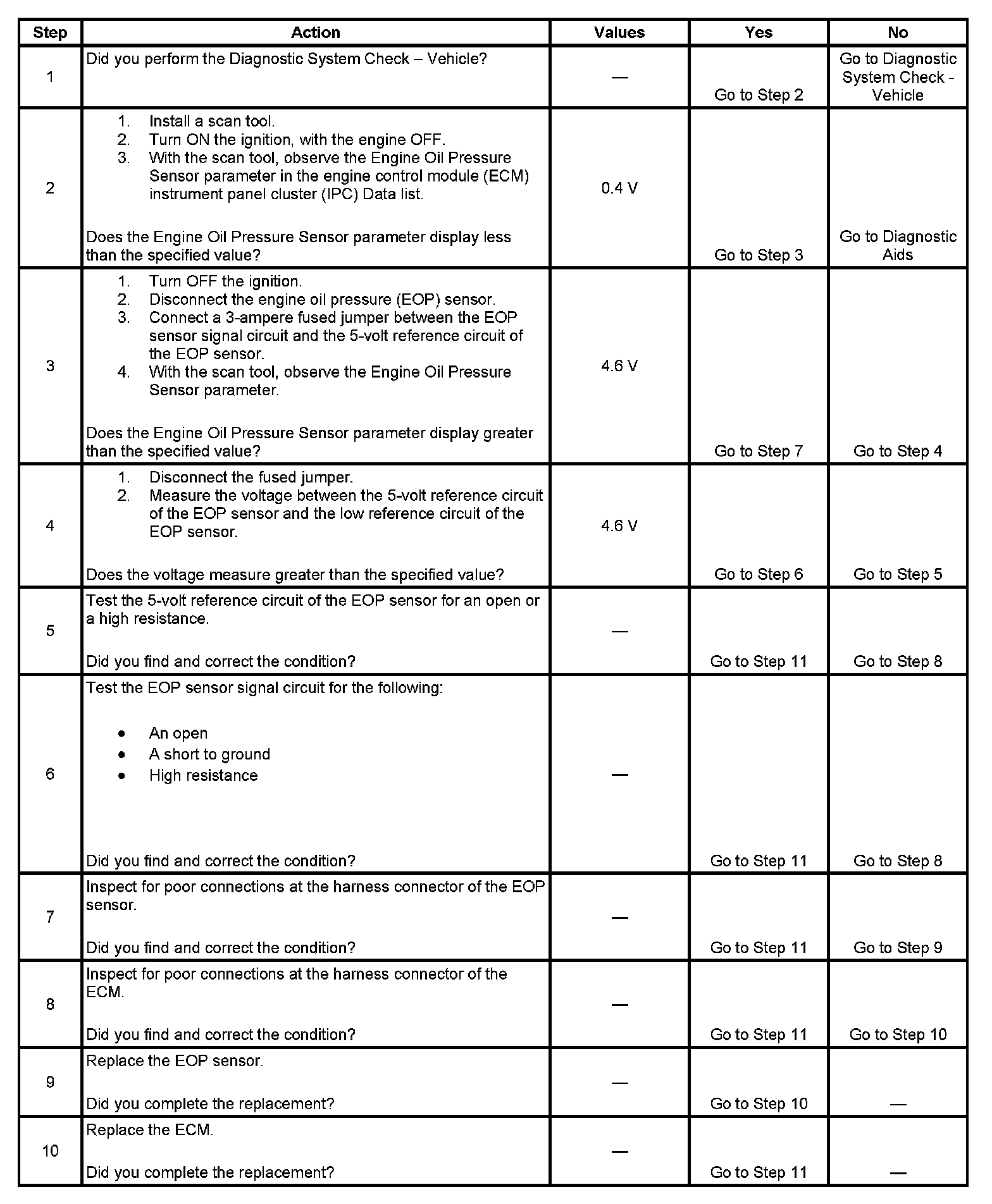 - The ECM detects that the EOP sensor signal circuit is less than 0.4 volts.