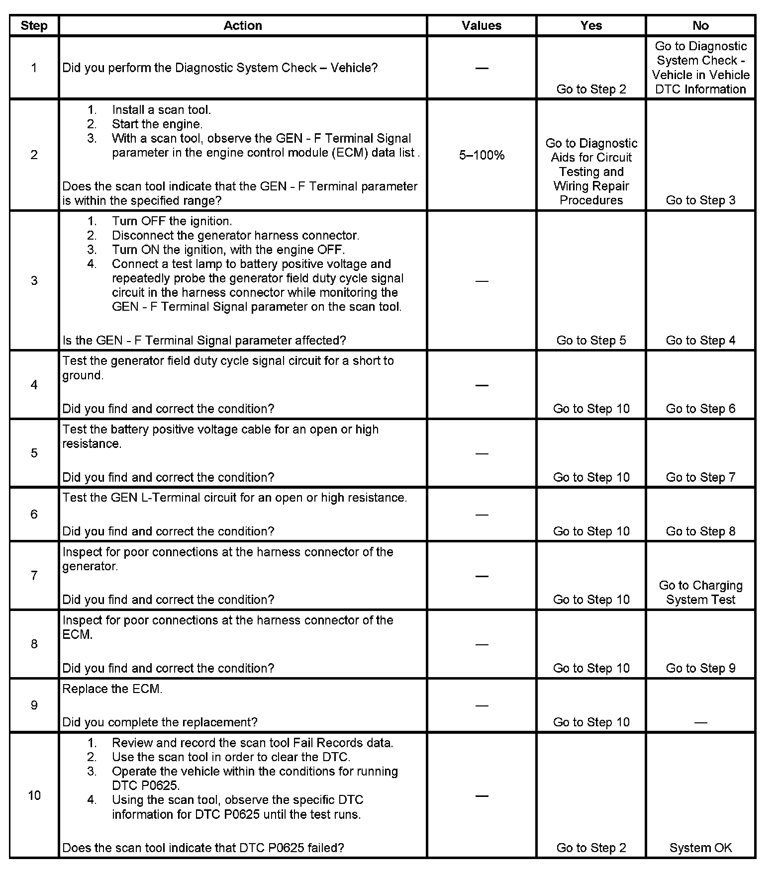 - The conditions for setting DTC P0625 are not present.