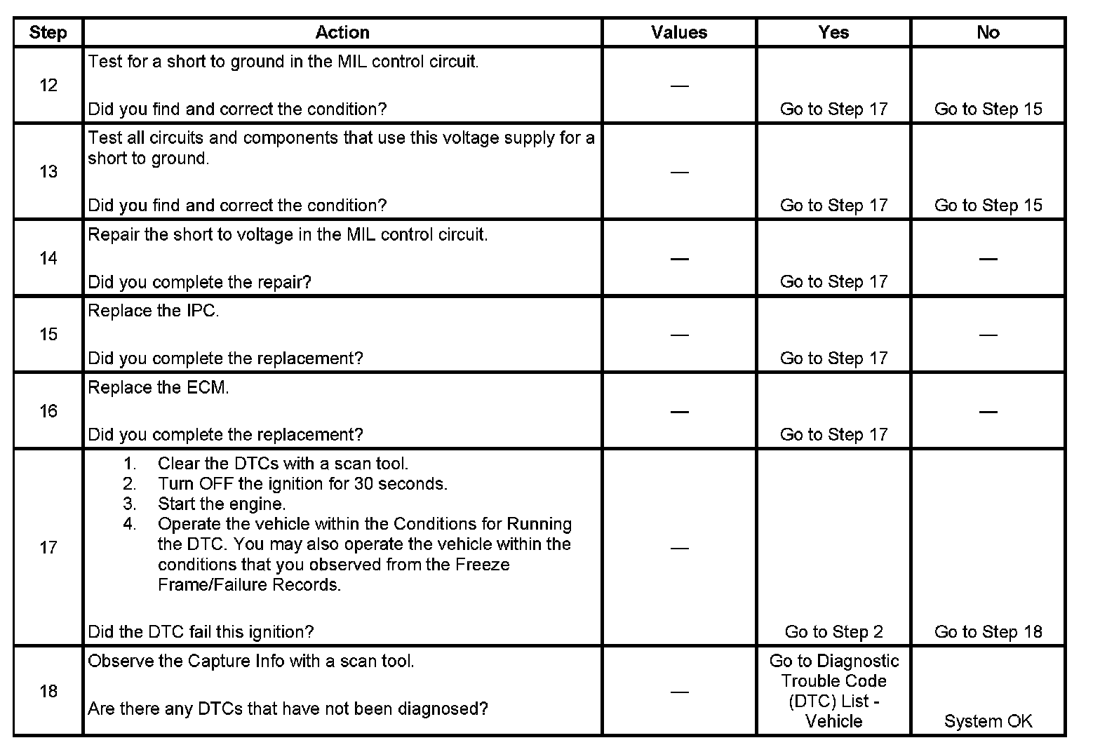 6. This step tests for a short to ground in the MIL control circuit. With the engine control module (ECM) disconnected and the ignition ON, the MIL should be OFF.