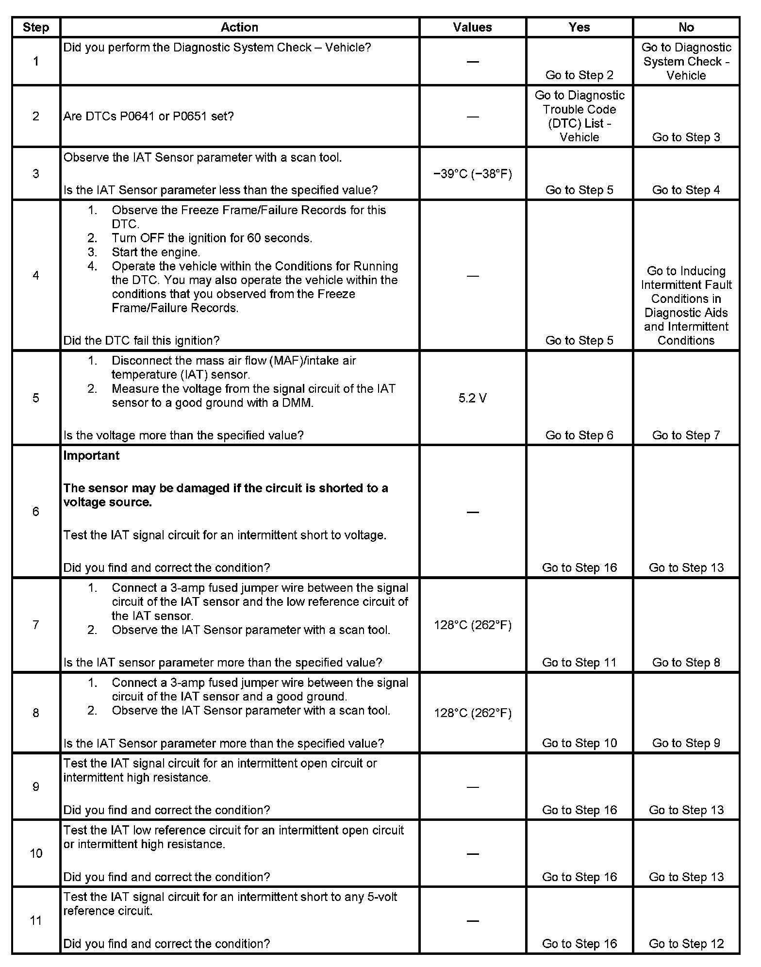 The intake air temperature (IAT) sensor is a variable resistor. The IAT sensor has a signal circuit and a low reference circuit. The IAT sensor measures the temperature of the air entering the engine. The engine control module (ECM) supplies 5 volts to the IAT signal circuit and a ground for the IAT low reference circuit. When the IAT sensor is cold, the sensor resistance is high. When the air temperature increases, the sensor resistance decreases. With high sensor resistance, the ECM detects a high voltage on the IAT signal circuit. With lower sensor resistance, the ECM detects a lower voltage on the IAT signal circuit. If the ECM detects an excessively high IAT signal voltage, indicating a low temperature, DTC P1111 sets.