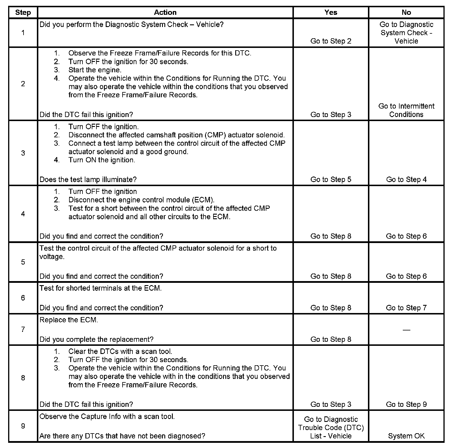 The camshaft position (CMP) actuator system is comprised of 4 CMP actuator solenoids, 4 oil control valves, and 4 CMP actuators. The engine control module (ECM) sends an electrical signal through the control circuits to the CMP actuator solenoids when a cam timing change is desired. The ground circuits of the CMP actuator solenoids are used as a return. If the ECM detects a high voltage condition on one of these circuits, DTC P2089, P2091, P2093, P2095 sets.