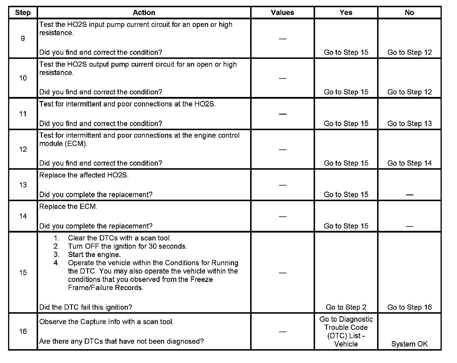 The wide band heated oxygen sensor (HO2S) measures the amount of oxygen in the exhaust stream more quickly and accurately than the switching style HO2S. The wide band sensor consists of an oxygen sensing cell, an oxygen pumping cell, and a heater. The exhaust gas sample passes through a diffusion gap between the sensing cell and the pumping cell. The engine control module (ECM) supplies a signal voltage to the HO2S and uses this voltage as a reference to the amount of oxygen in the exhaust system. An electronic circuit within the ECM controls the pump current through the oxygen pumping cell in order to maintain a constant signal voltage. The ECM monitors the voltage variation on the signal circuit and attempts to keep the voltage constant by increasing or decreasing the amount of current flow, or reversing the direction of the current flow to the pumping cell. By measuring the direction and amount of current required to maintain the signal voltage, the ECM can determine the concentration of oxygen in the exhaust. The signal voltage is displayed as a lambda value. A lambda value of 1 is equal to a stoichiometric air fuel ratio of 14.7:1. Under normal operating conditions, the lambda value will remain around 1. When the system is lean, the oxygen level will be high and the lambda value will be high, or more than 1. When the system is rich, the oxygen level is low and the lambda value will be low, or less than 1. The ECM uses this information to maintain the proper air/fuel ratio. If the ECM detects one of the HO2S pumping circuits is open DTC P2237 will set for bank 1 sensor 1, or DTC P2240 will set for bank 2 sensor 1.