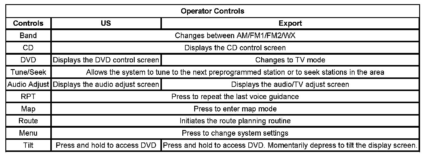 This component acts as the operator interface for the navigation system, provides the data input from the operator to the navigation system and provides navigation information to the operator via the display screen. The navigation radio is located in the center of the instrument panel. The navigation radio provides the following: