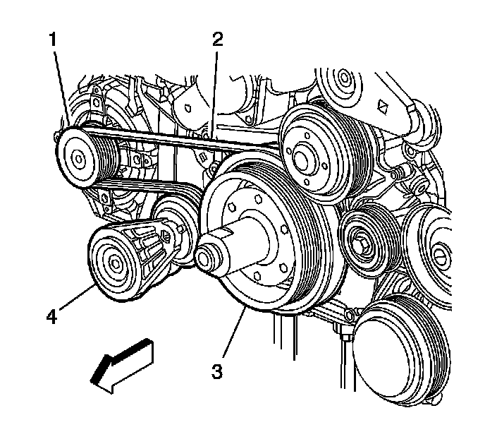 1. Route the generator drive belt to the crankshaft pulley (3) and the tensioner (4).
