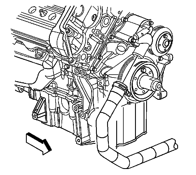 10. Using the J38185, disengage the tension on the hose clamp and install the radiator outlet hose to the thermostat housing.