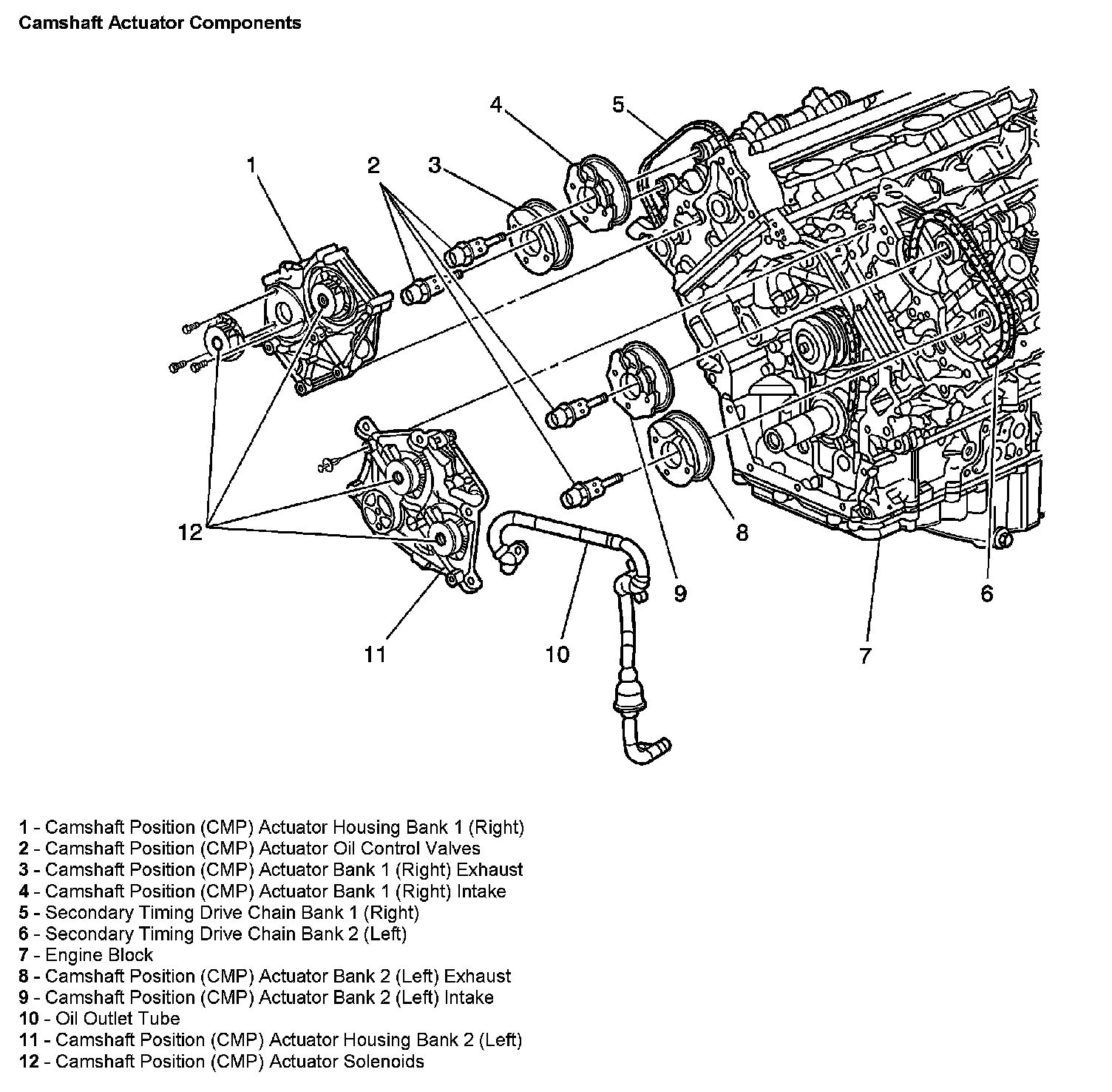 An oil outlet tube is used to transfer oil from a dedicated oil galley in the engine block, from the replaceable oil filter, up to each head and is located in the timing chain area. The oil outlet tube incorporates a non-replaceable 40 micron oil filter. If the filter becomes clogged with contamination and can not be cleaned, the tube and filter must be replaced as an assembly. Engine oil pressure, level, viscosity, and temperature can have an adverse affect on the CMP actuator performance.