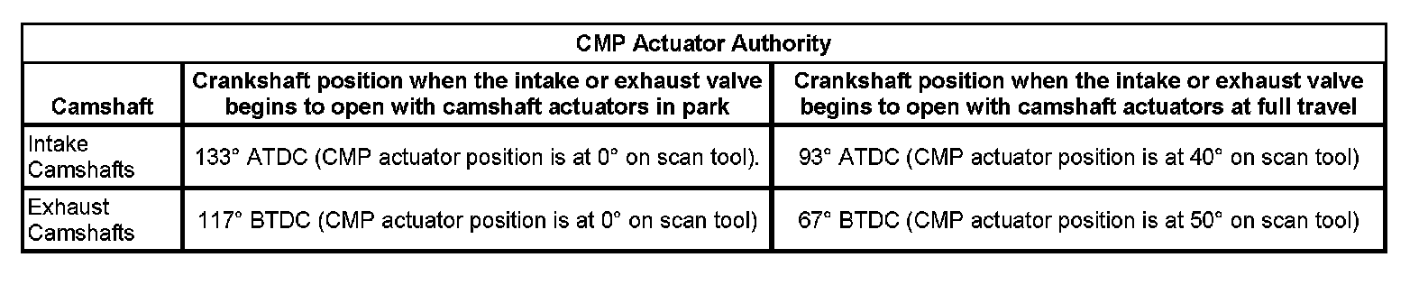 The CMP actuators interface the timing chain to the camshafts, and are able to change the camshaft timing in relation to the crankshaft. The intake CMP actuators have the ability to move the intake camshafts a total of 40 degrees from the parked position. The exhaust CMP actuators have the ability to move the exhaust camshafts a total of 50 degrees from the parked position. With the engine OFF or with the CMP actuators not commanded, the exhaust CMP actuators are parked at the full advance position of 133 degrees ATDC and the intake CMP actuators are parked at the full retard position of 117 degrees before top dead center (BTDC). The CMP Angle parameters on the scan tool will indicate 0 degrees with the engine running and the CMP actuators in the parked position for both exhaust and intake camshafts.