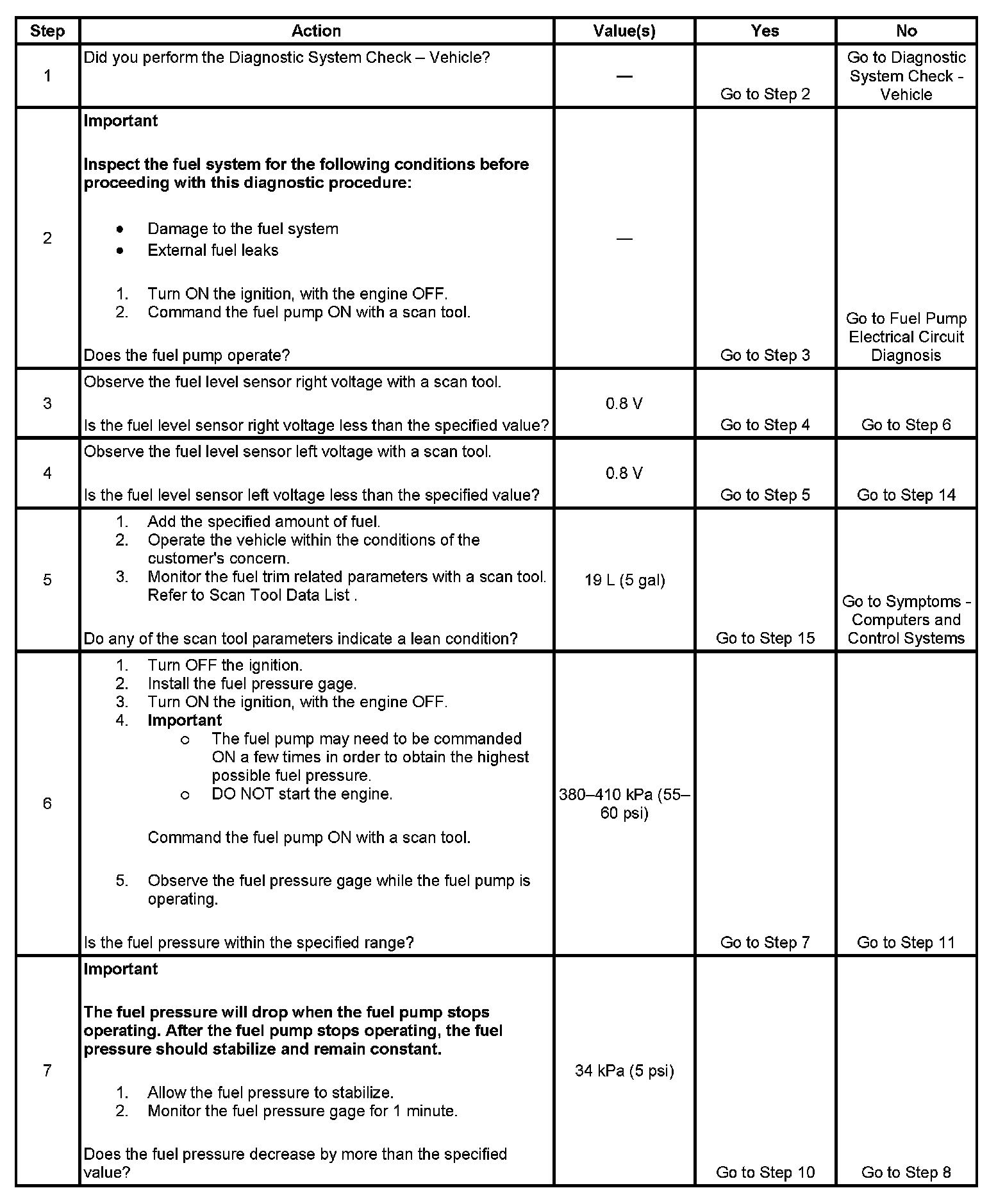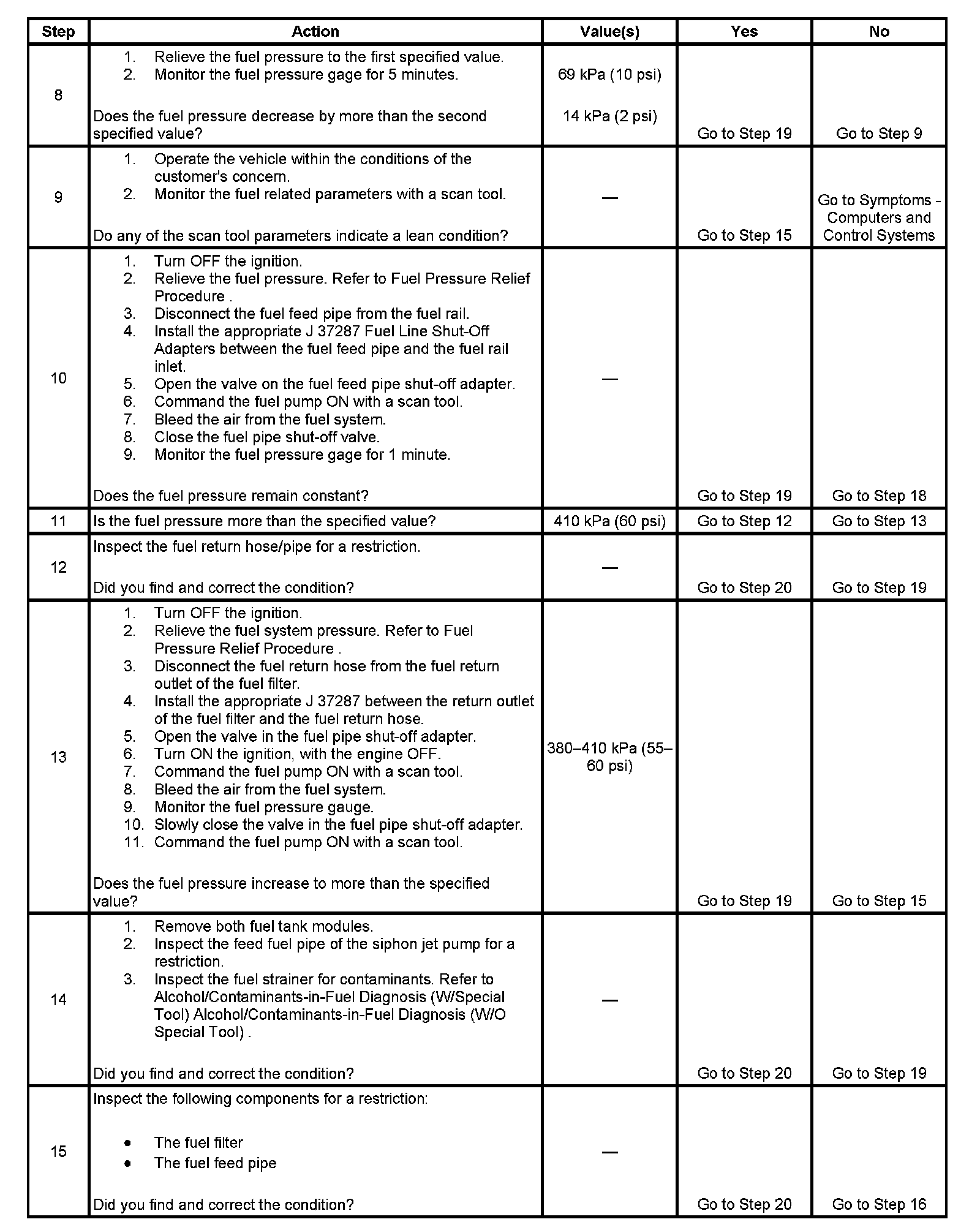 7. This step tests for an internal fuel leak. If the fuel pressure drops during this test, then an internal loss of pressure is indicated.