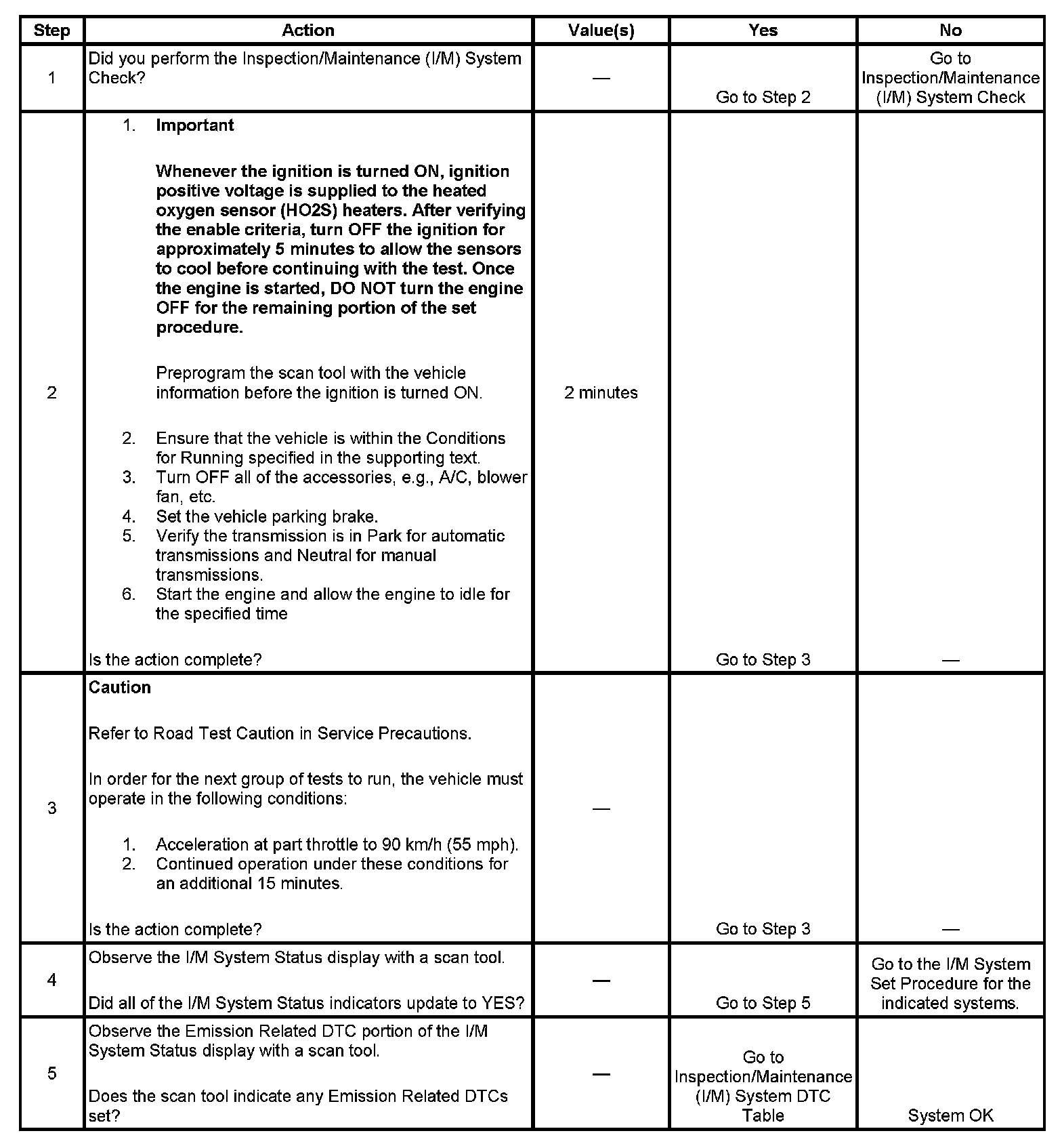 The purpose of the Inspection/Maintenance (I/M) Complete System Set Procedure is to satisfy the enable criteria necessary to execute all of the I/M readiness diagnostics, and complete the trips for those particular diagnostics. When all diagnostic tests are completed, the I/M System Status indicators are set to YES. Perform this test when more than one or all of the I/M System Status indicators are set to NO.