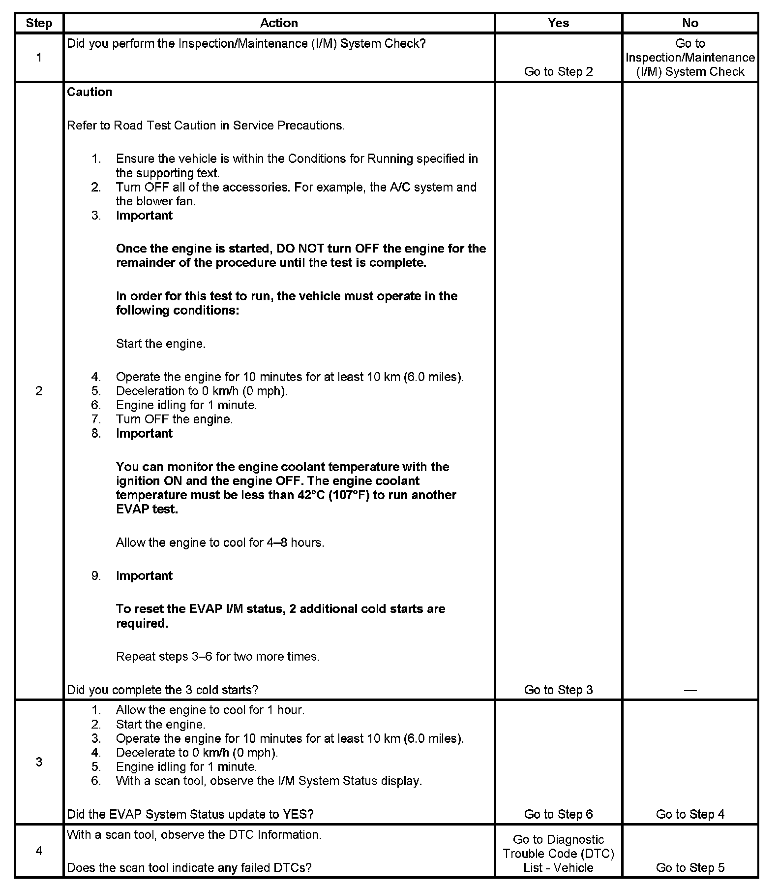 The purpose of this test is to satisfy the enable criteria necessary to execute I/M readiness diagnostics for the evaporative emission (EVAP) system. The test may be used to set the I/M System Status indicators to YES. Ensure the vehicle meets the requirements listed in Conditions for Running before performing the EVAP System Test. Failure to meet the necessary requirements may produce inaccurate test results.
