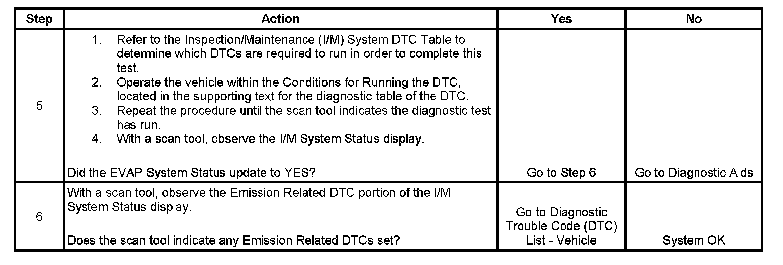 4. This step is to identify a first failure of a type B DTC. A DTC only appears on the I/M System Status display when it becomes a MIL illuminating DTC. This occurs on the second failure of a type B DTC. A first failure of a type B DTC will not allow the I/M System Status to update to YES. Refer to Diagnostic Aids.
