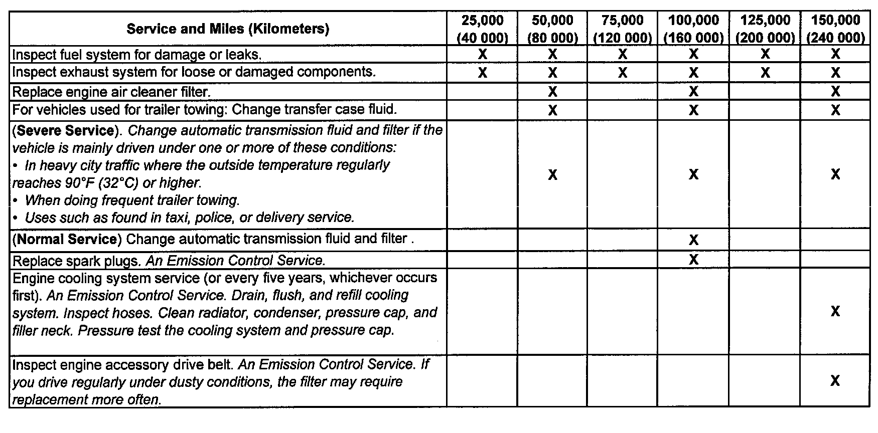 service (I or II) after the indicated miles (kilometers) shown for each item.