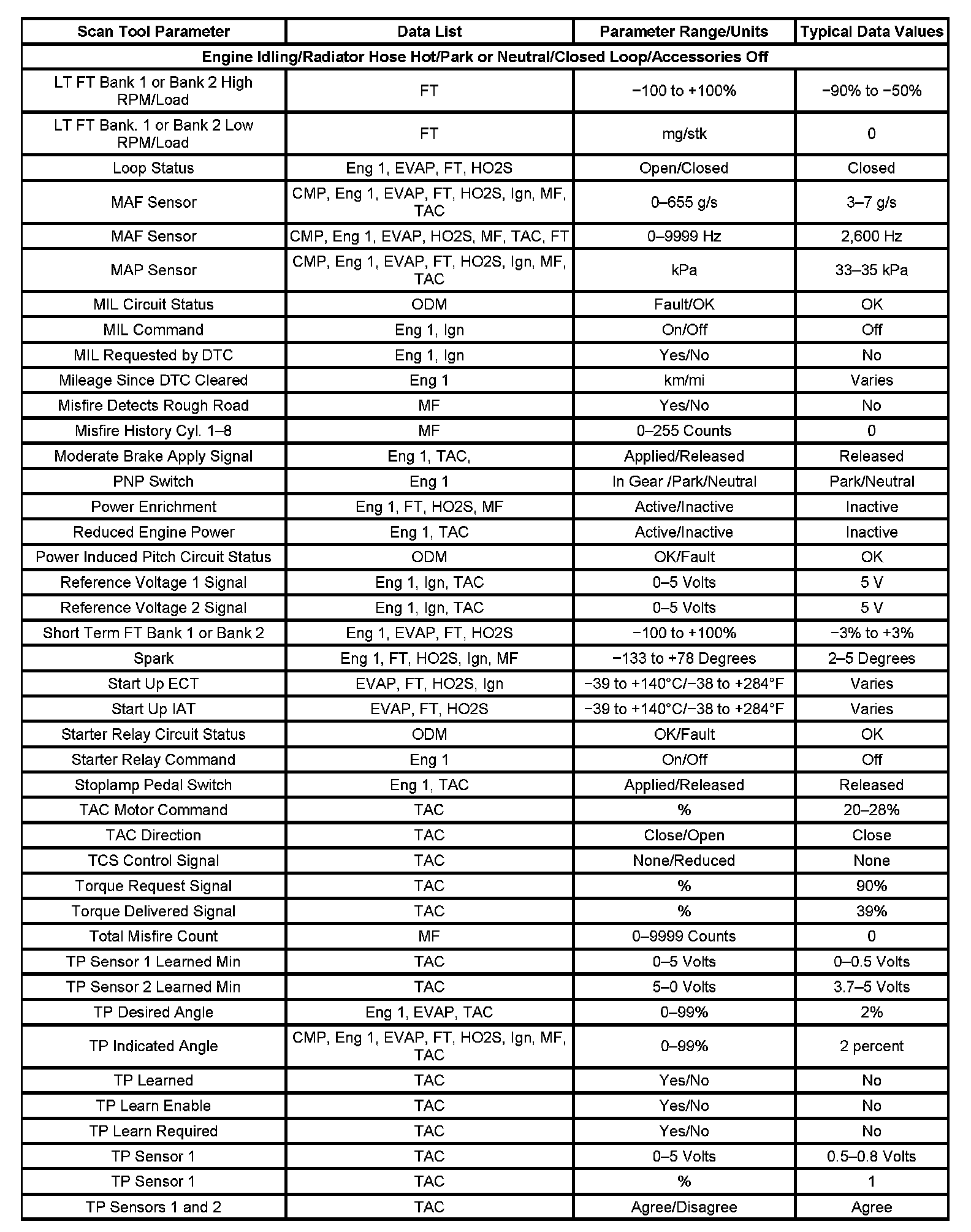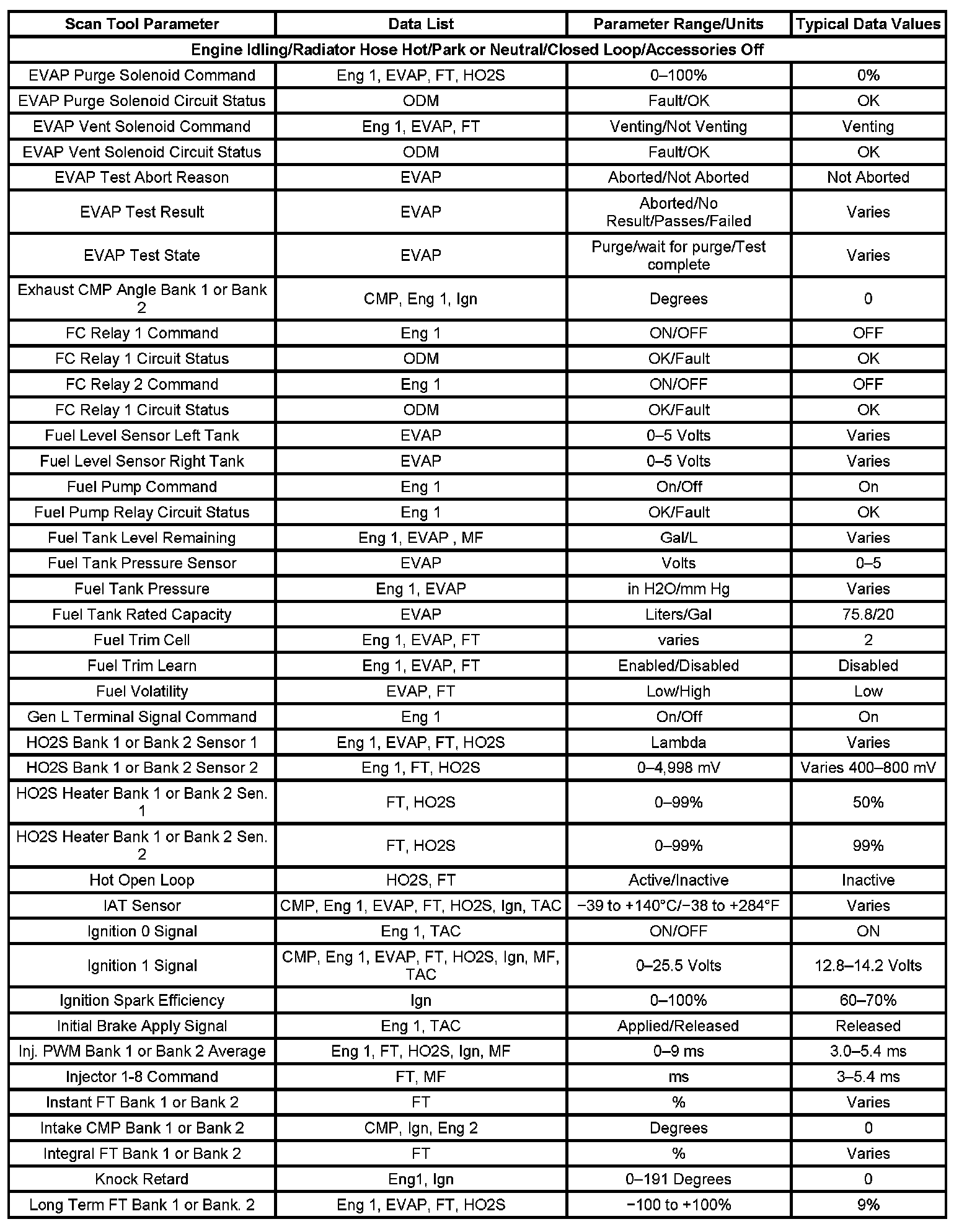 Scan tool values from a properly running engine may be used for comparison with the engine you are diagnosing. The Engine Scan Tool Data List represents the values that would be seen on a normal running engine.