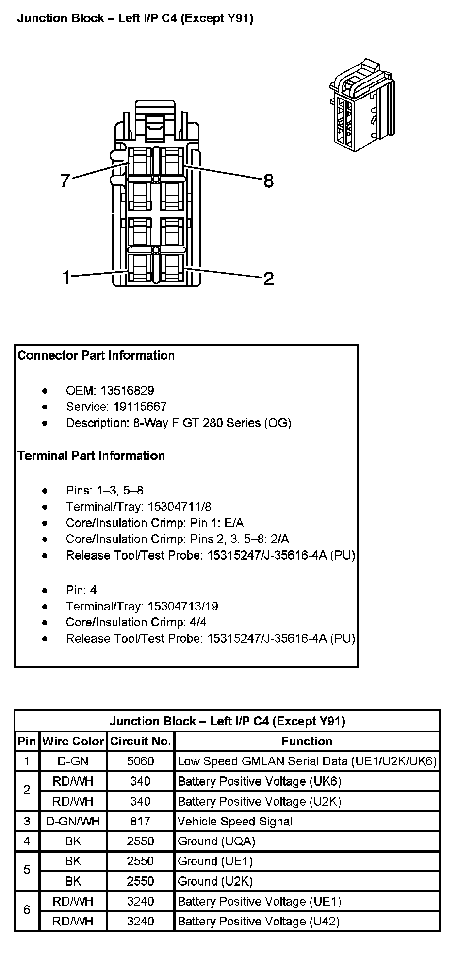 Junction Block - Left I/P C4 (Except RPO Code Y91) (Pin 1 To 6):