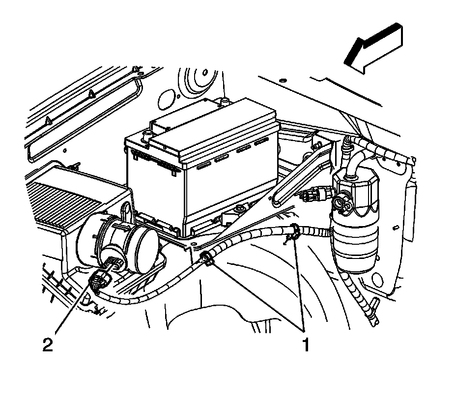 1. Disconnect the engine wiring harness electrical connector (2) from the MAF/IAT sensor.