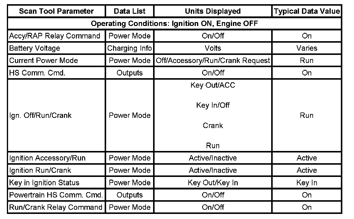 The scan tool data values were taken from a known good vehicle under the following conditions: