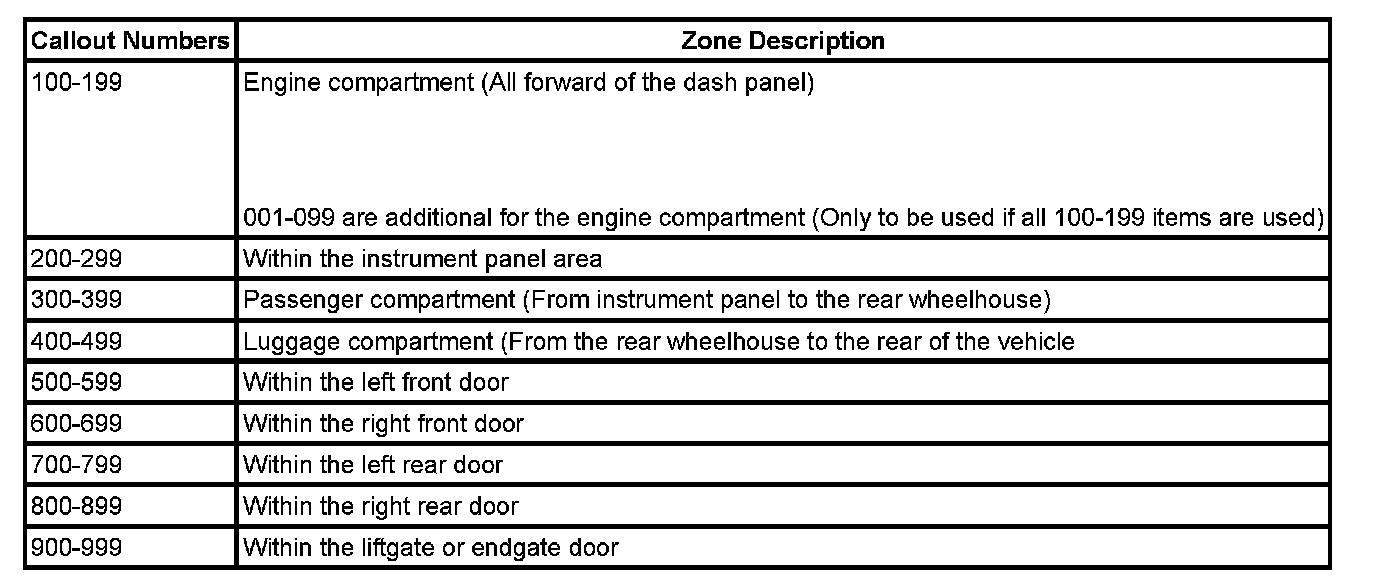 All grounds, in-line connectors, pass-through grommets, and splices have identifying numbers that correspond to where they are located in the vehicle. The table explains the numbering system.