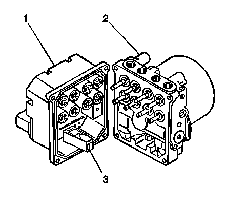 3. Make sure that the internal pump motor connector (3) is installed into the new EBCM (1) prior to EBCM replacement.