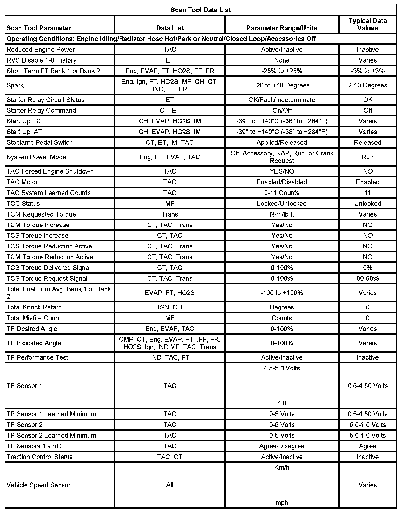 The Engine Scan Tool Data List contains all engine related parameters that are available on the scan tool. The list is arranged in alphabetical order. A parameter may appear in any one of the data lists, and in some cases may appear more than once, or in more than one data list in order to group certain related parameters together.