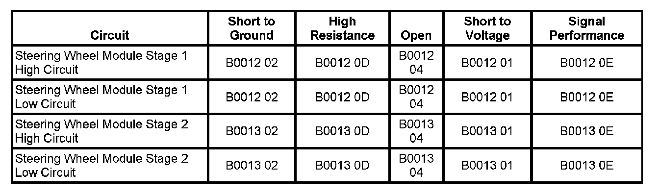 The steering wheel module high and/or low circuit is short to voltage for 120 milliseconds.
