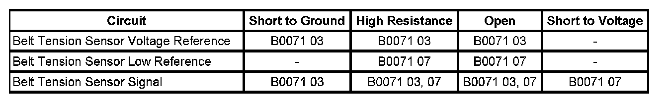 * The PPS detects the voltage at the belt tension sensor signal circuit is less than 0.5 volt or greater than 4.5 volts for 500 milliseconds.