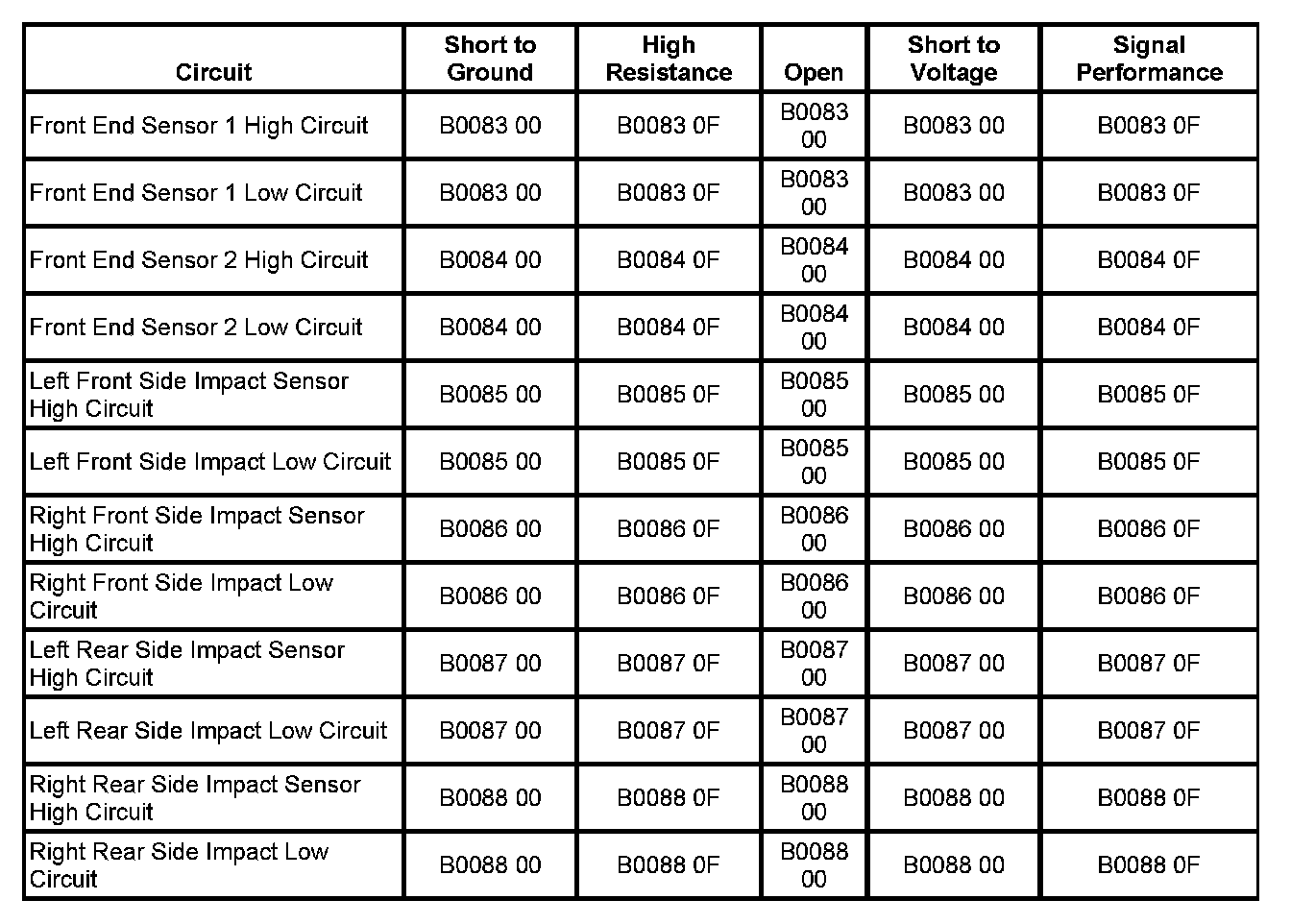 The inflatable restraint front end sensor utilizes a unidirectional 2-wire circuit. The front end sensor modulates current on the interface to send ID, state of health, and deployment commands to the inflatable restraint sensing and diagnostic module (SDM). The SDM serves as a power source and a ground for the front end sensor. When the ignition is turned ON and input power from the SDM is first detected, the front end sensor responds by performing internal diagnostics and sending an ID to the SDM. The SDM considers the ID to be valid if the response time is less than 5 seconds. The front end sensor continually communicates status messages to the SDM, which determines if a fault is present in the front end sensor circuit. When a fault is detected, the SDM may reset the front end sensor up to 2 times by removing and reapplying power to it. If the fault is still present, the SDM will set a DTC.
